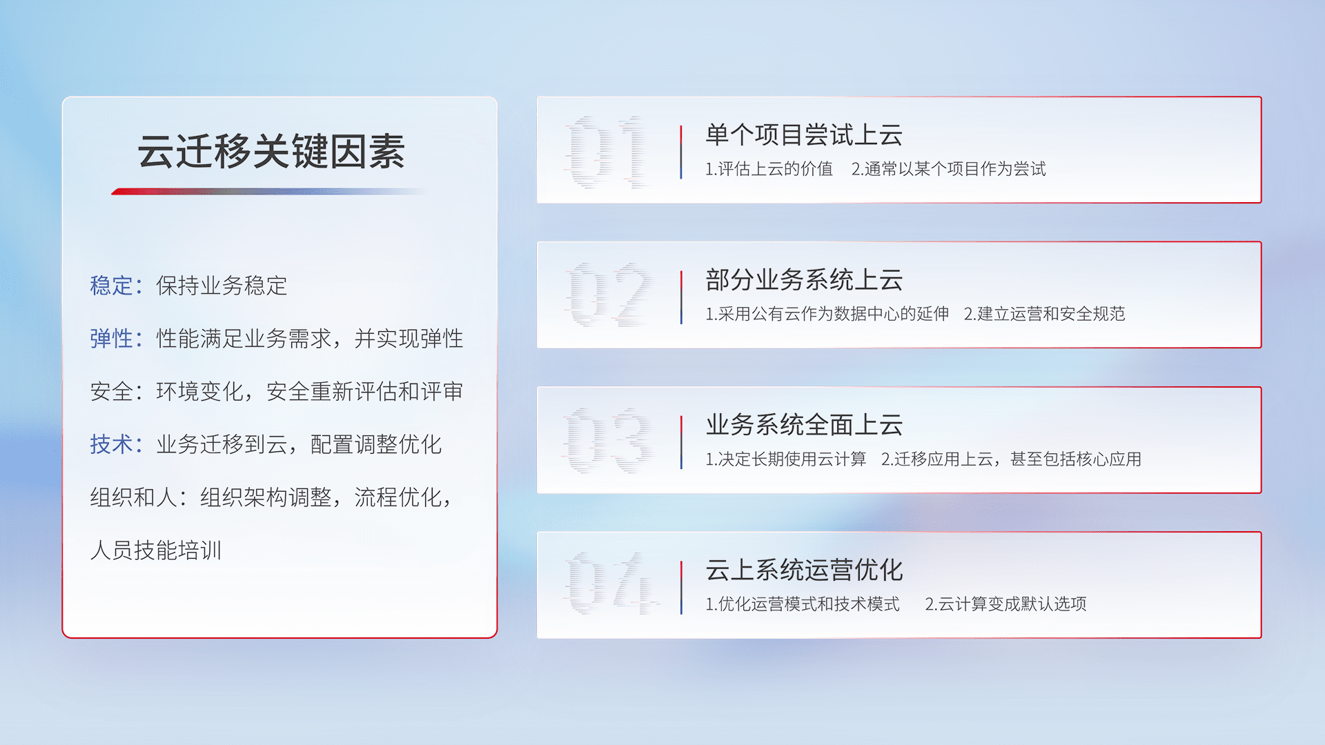 结合实际业务,,,从规划设计、、云平台选型、、、云原生改造、、数据迁移、、、集成交付,,迁移全过程为客户识别最佳上云路径,,做好风险识别管理,,,设计网络架构、、身份权限、、、、安全审计合规、、操作审计、、日志审计、、、、监控告警策略、、、多站点容灾设计等,,,,对云上基础设施进行整体规划,,,提升IT治理水平,,以满足弹性、、、、高可用、、高性能的需求。。
