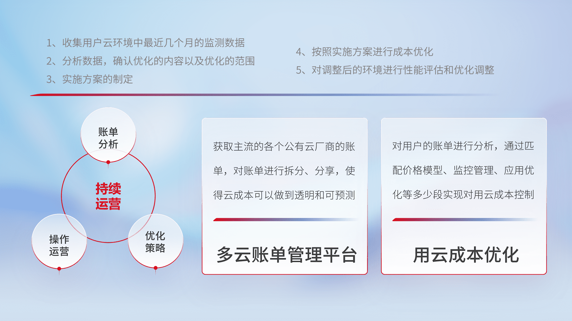 通过灵活运用多种自动化迁移工具,,,,帮助企业用户实现业务和数据高效 、、、稳定的上云迁移和云上迁移,,,,采用自研多云纳管平台,,,,以中立管理模式,,解决多组织、、、、多云、、多运维厂商的复杂关系的管理,,,,保证多云平台资源配置的一致性,,实时掌控云资源运行数据,,,,运用智能化工具分析云资源多云平台的管理服务,,透明化管理成本支出,,,用云成本可预测、、、用云费用可优化、、、、云资源配额有据可依。。。