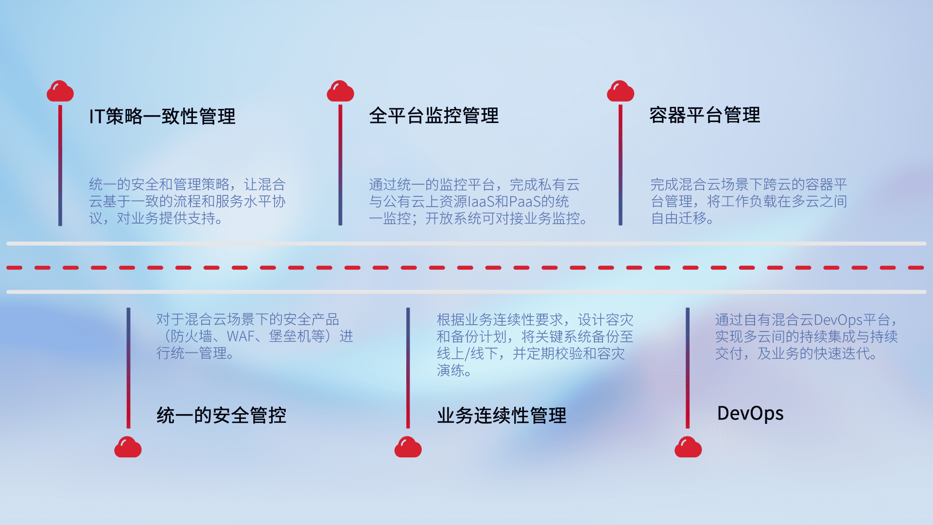 通过多云纳管,,,以统一的资源数据模型把客户的云资源进行抽象和封装,,,进而实现对多云资源的统一操作,,,,保障云资源管理的可靠性、、、、稳定性与可用性。。。量身定制化运维内容,,,,配置、、开发运维、、、补丁管理、、、、备份、、、监控、、、、认证和访问管理、、审计和日常巡检等,,,保障在用云过程中的可靠度,,稳定度以及高可用率。。。。