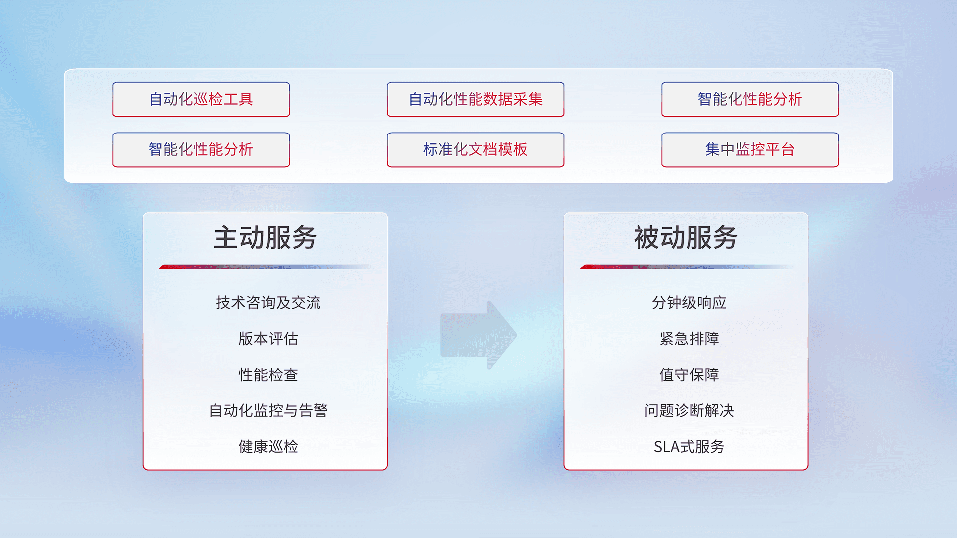 智能化工具和标准化文档,,,保障服务质量,,提供主动服务(包含技术咨询、、、版本评估、、性能检查、、自动化监控与告警、、健康巡检)和被动服务包含(分钟级响应、、紧急排障、、值守保障、、、、问题诊断解决、、、SLA服务)。。。。