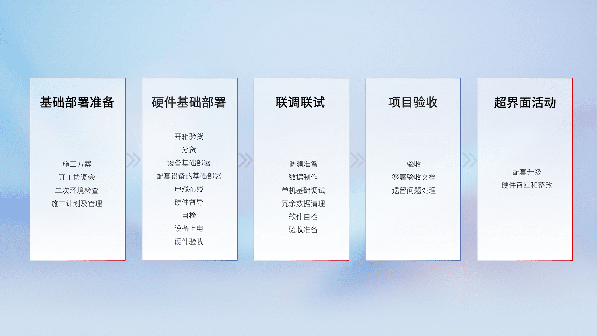 从基础部署准备、、、硬件基础部署、、联调联试、、项目验收、、、越界面活动的全过程可追溯,,保证施工质量和进度。。。。