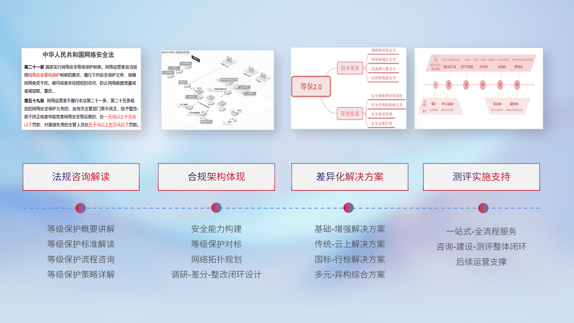 通过专业的法律咨询解读、、、合规架构体现、、、、差异化解决方案、、、测试实施支持等服务,,为客户量身打造等保合规体系。。。。